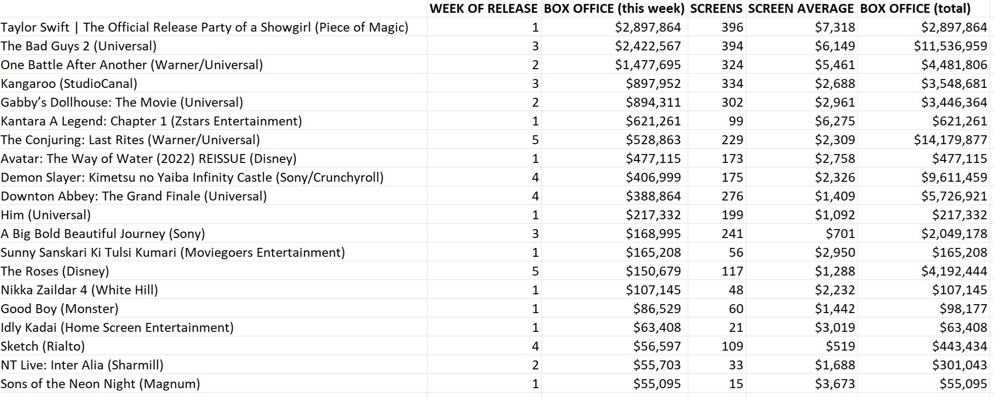 Even though it will turn out to be the highest earner ever for a Paul Thomas Anderson film, One Battle After Another will end up losing money on its investment; an awareness builder/loss leader for its streaming release on HBO Max, or whatever it is called today. At the other end of the spectrum, Taylor Swift – The Official Release Party of a Showgirl, a promotion for her new album basically, where the top line items in the budget would be Swift and the music that she owns, will multiply its production budget hundredfold.