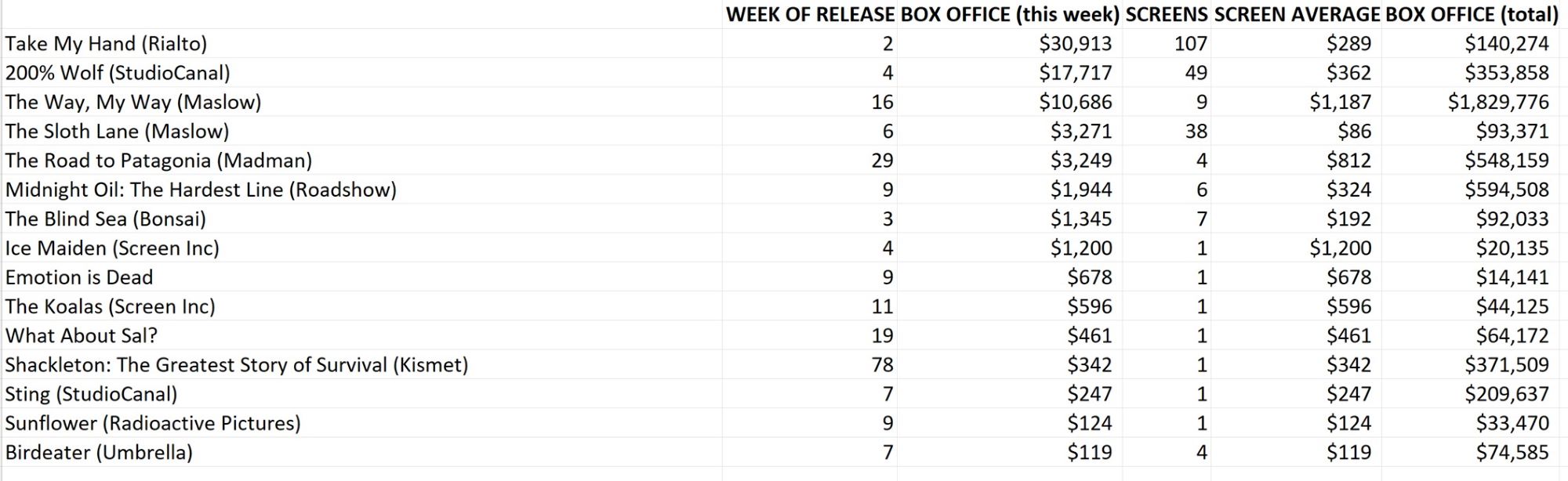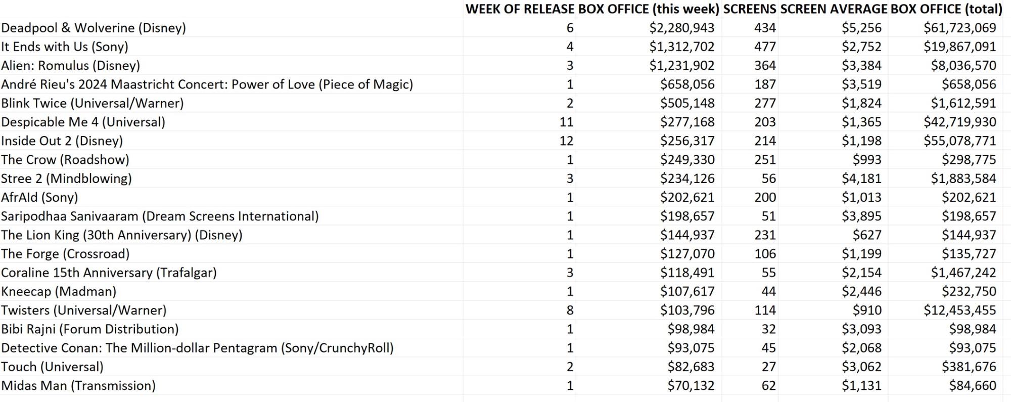Another André Rieu concert performed well with very limited screenings, whilst The Crow, AfrAId, The Lion King 30th Anniversary and Midas Man bombed despite relatively wide releases. Meanwhile, limited releases for Touch and I Saw the TV Glow (which ranked just outside the top 20) are performing well. And, Australia seems to have caught the faith film bug, with The Forge following in the footsteps of Unsung Hero in capturing the public’s attention, especially regionally. Amen!