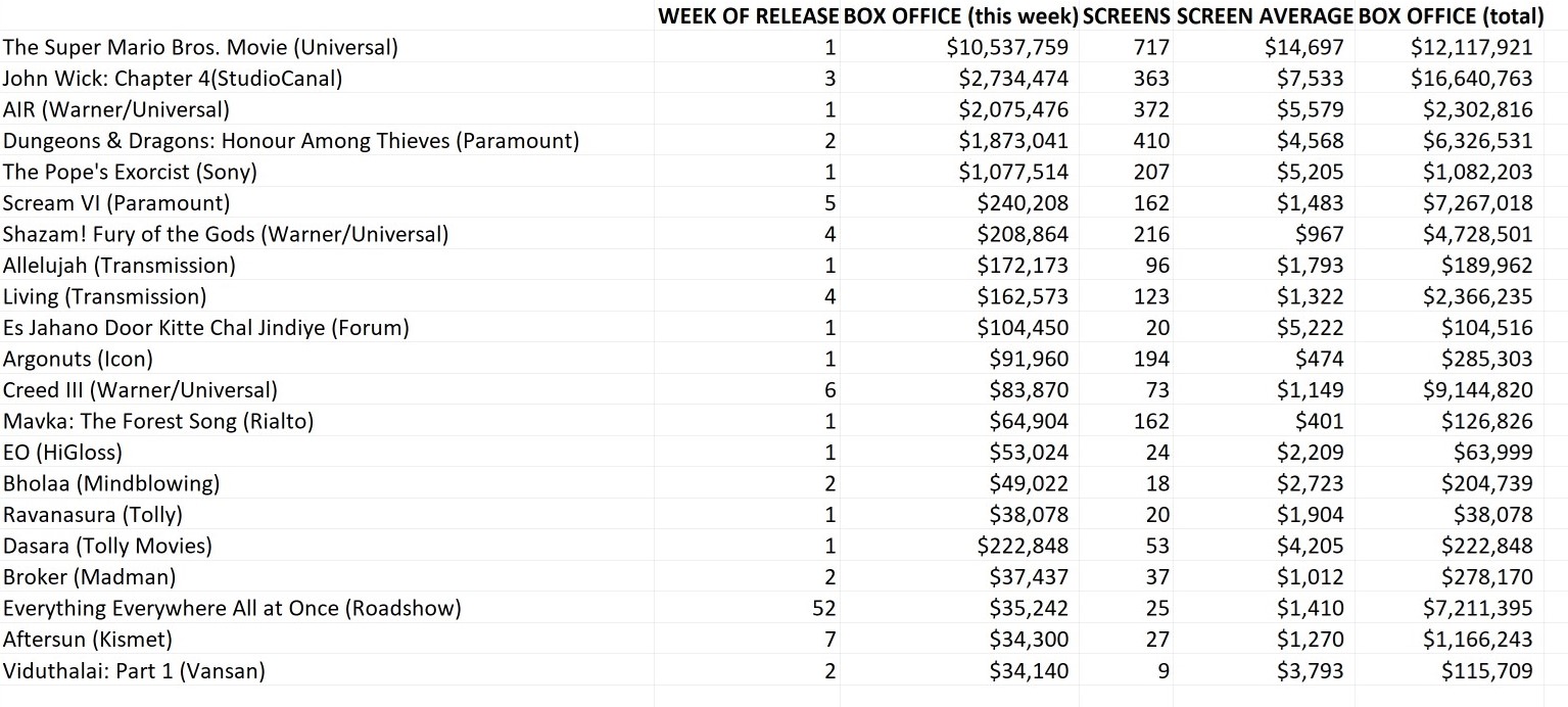 Box Office Report: April 6 – 9, 2023 3 years agoRead time: Less 1 minThe young and the young at heart swarmed to The Super Mario Bros. Movie, whilst AIR and The Pope's Exorcist opened respectively. by FilmInk Staff Shares: Previous PostLand of The GiantsNext PostTrailer: Silo