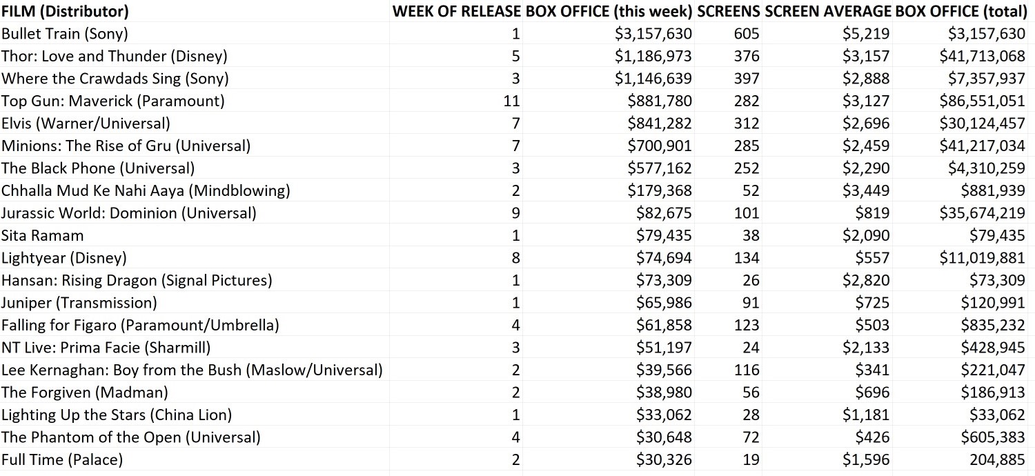 Brad Pitt and his zany assassins in Bullet Train have dethroned Thor from a fifth week atop the Australian box office, but apart from that the order is pretty much the same as last week. Worth noting is the disappointing opening for Kiwi film Juniper, which opened pretty wide, for better or worse.