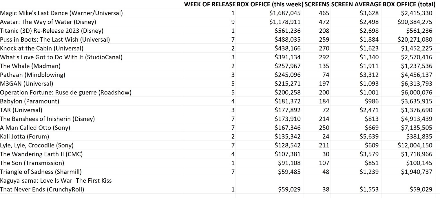 As predicted last week, Avatar 2 has finally been displaced from the top spot, with Magic Mike's Last Dance getting audiences of a certain demographic into cinemas, especially through initiatives such as Chicks at the Flicks, etc. The 3D re-release of Titanic drew strong numbers, at a premium price point, which would have helped, but overall, the numbers were quite disappointing across the board this weekend, signalling near empty cinemas for most sessions.