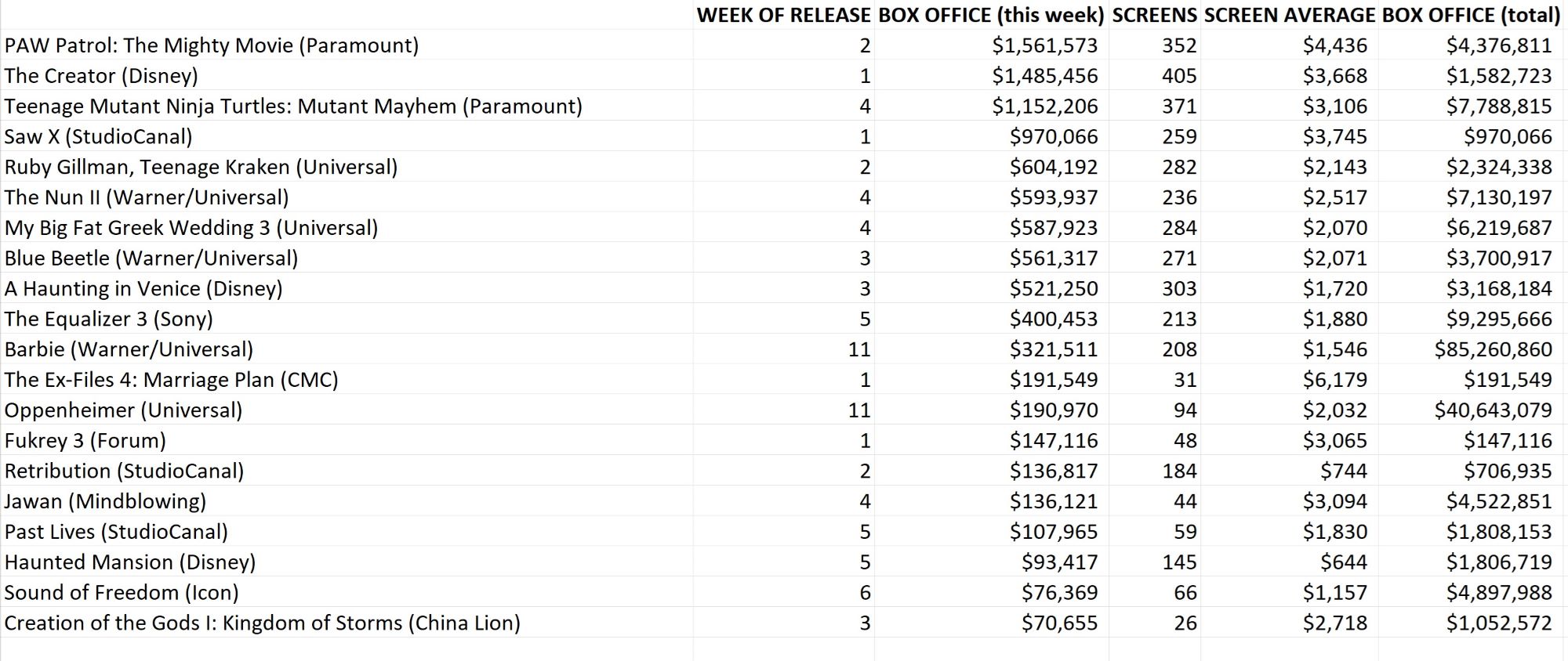 It may not have come close to Barbenheimer numbers, but original IP The Creator's strong opening bodes well as a reflection of the public's thirst for quality big screen entertainment. It certainly helped that Disney backed the film in their marketing, and promoting the film's, um, creator Gareth Edwards at a time when cast (not that they're that marketable) were unavailable. In other news, school holiday fare is performing particularly well, especially for Paramount; and who would have thunk that TMNT would creep up to a very notable $10m result here without topping the charts at any stage?