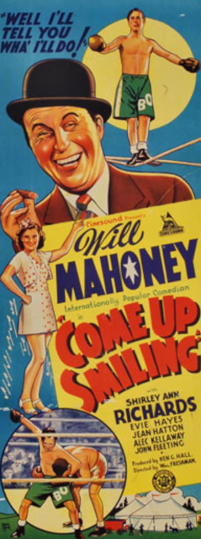 By 1939, Ken G Hall knew that the most sure-fire genre of Australian cinema was a popular comedian in a star vehicle. With Come Up Smiling, he tried to vary the formula a little – first of all, it would star an internationally famous foreign comedian rather than someone local: American Will Mahoney, who had made a few visits to Australia, most recently in 1938. Secondly, it would be the first Cinesound feature not directed by Hall – instead, the company imported Australian-born William Freshman, who had spent most of his career in England as an actor and director. This would, in theory, free up Hall’s schedule to enable him to prepare some bigger-budgeted movies, notably the long-announced Robbery Under Arms and Overland Telegraph (spoiler number one: this didn’t happen because of World War Two).