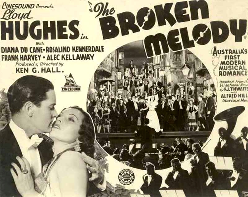 The Broken Melody focused on John Ainsworth, a violin-playing, hard-drinking, champion-rowing uni student, who gets expelled after brawling in a night cub (in Thwaites’ novel it was drug addiction). Disowned by his grazier father, and unable to get a job in the depression, John is down and out in Sydney but forms a friendship with Joe, a pickpocket, and Ann, a former nightclub singer that he saves from suicide. John’s violin talent is overheard by some impresarios, leading to him becoming a star performer/conductor/composer in London, although he loses Ann who “lets him go”. John returns to Australia to perform an opera based on Ann’s character; he is reunited with his father and with Ann, who turns out to be performing in the opera.