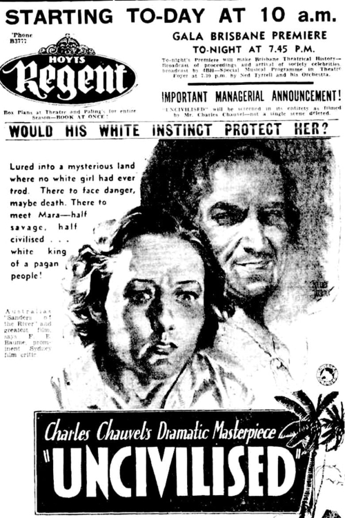 This was Chauvel’s fifth feature as director; his first two had been silents (Moth of Moonbi, Greenhide), then he made two historical sound epics, In the Wake of the Bounty (Errol Flynn’s first movie) and Heritage. None of Chauvel’s films had been particularly popular at the box office – indeed, it’s a tribute to his tenacity that he kept raising finance – and with Uncivilised he seemed motivated to make something more “commercial” … to wit, a knock-off of Tarzan, H. Rider Haggard and numerous other jungle adventure tales about white men lording it among the savages. Chauvel argued that he was inspired by stories of real-life Australians who lived among Aboriginals, but the real impetus for Uncivilised were the pulp dramas of the time.