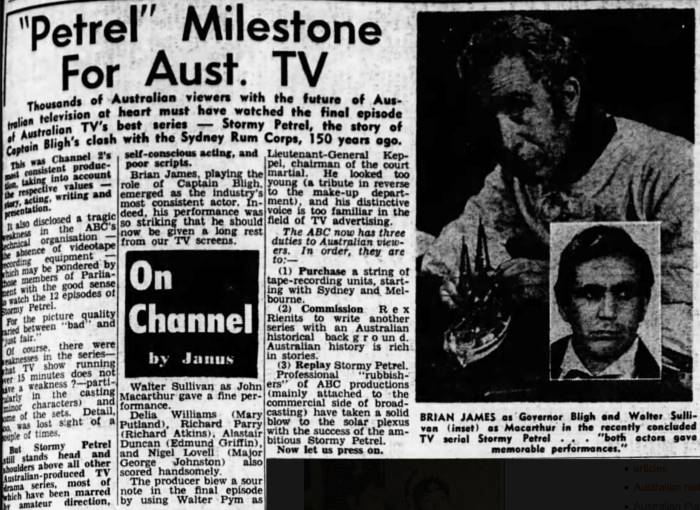 In addition to those ABC mini-series, Stormy Petrel prompted ATN-7 to make their own historical series starring Brian James, Jonah (1962). This was meant to be a recurring series rather than a limited-run serial, focusing on the adventures of a Sydney merchant in the 1840s (or thereabouts) called Jonah (James) whose adventures would bring him into contact with real-life figures from colonial Australia such as Ludwig Leichhardt, Ben Boyd, and Lady Franklin. Reception to the series was strong – the ratings exceeded that for Stormy Petrel – and it sold to the UK. However, the latter achievement ended up inadvertently sealing Jonah’s doom – Actor’s Equity demanded residuals for the cast from the foreign sale, the production company refused, the union went on strike and the show was axed prematurely. It was a totally full-on situation that contributed to no new drama being made on the commercial stations in 1963 and stands as a reminder as to why we need a drama quota.