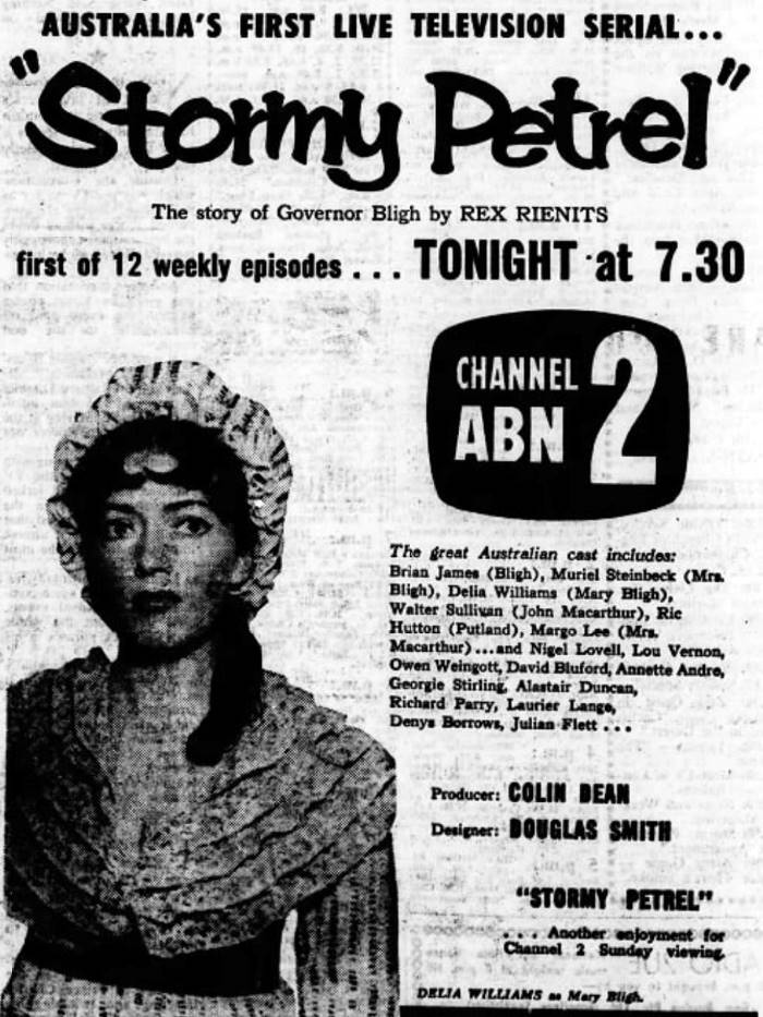 The radio serial of Stormy Petrel told the story of Captain William Bligh, focusing on the two main turbulent events of that man’s life, the Mutiny on the Bounty and the Rum Rebellion. Rienits was motivated to write it, in part, by his feeling that Bligh had been slandered in the 1935 Hollywood film Mutiny on the Bounty and wanted to rectify the man’s reputation. The serial was very well received, selling to Britain and being reprised on Australian radio in 1953, 1959 and 1962.