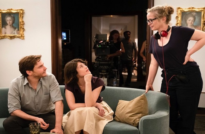 Julie Delpy with Daniel Bruhl and Gemma Arterton on the set of My Zoe.