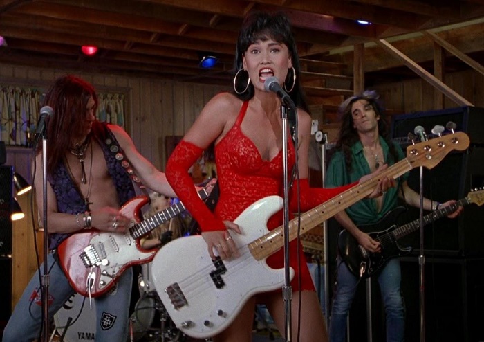 In 1992, Penelope Spheeris (The Decline Of Western Civilization) directed a teen comedy music flick for the ages with Wayne’s World, a big screen version of the popular Saturday Night Live skit about two suburban metal heads (creator Mike Myers and Dana Carvey) who host a community access TV show in their basement. This uproarious charmer introduced a whole new cultural lexicon (“Schwing!”, “A sphincter says what?”, “Extreme Close Up!”, “No way!” “Way!”), and made millions at the box office. It’s also undoubtedly one of the funniest films of the nineties…and it also features a great fictional rock band in the nicely named Crucial Taunt. Fronted by the exotic, sexy, self-possessed and utterly transfixing Cassandra Wong (played by Hawaii-raised Tia Carrere, who is of Filipino, Spanish and Chinese descent), Crucial Taunt are a hard-driving rock band, and perform four songs (“Ballroom Blitz”, “Fire”, “Touch Me”, “Why You Wanna Break My Heart”) in the film, two of which appear on the soundtrack. It’s no surprise that when Mike Myers’ Wayne sees Crucial Taunt playing at local club The Gasworks, he falls for Cassandra on the spot. Though Wayne’s World is noted for cameos by real rockers Meat Loaf and Alice Cooper, Crucial Taunt bring it big time, with the talented Tia Carrere also doing all of her own singing. “I’m not really this rock’n’roll chick,” Carrere has very surprisingly said of playing ultimate rock’n’roll chick Cassandra Wong.