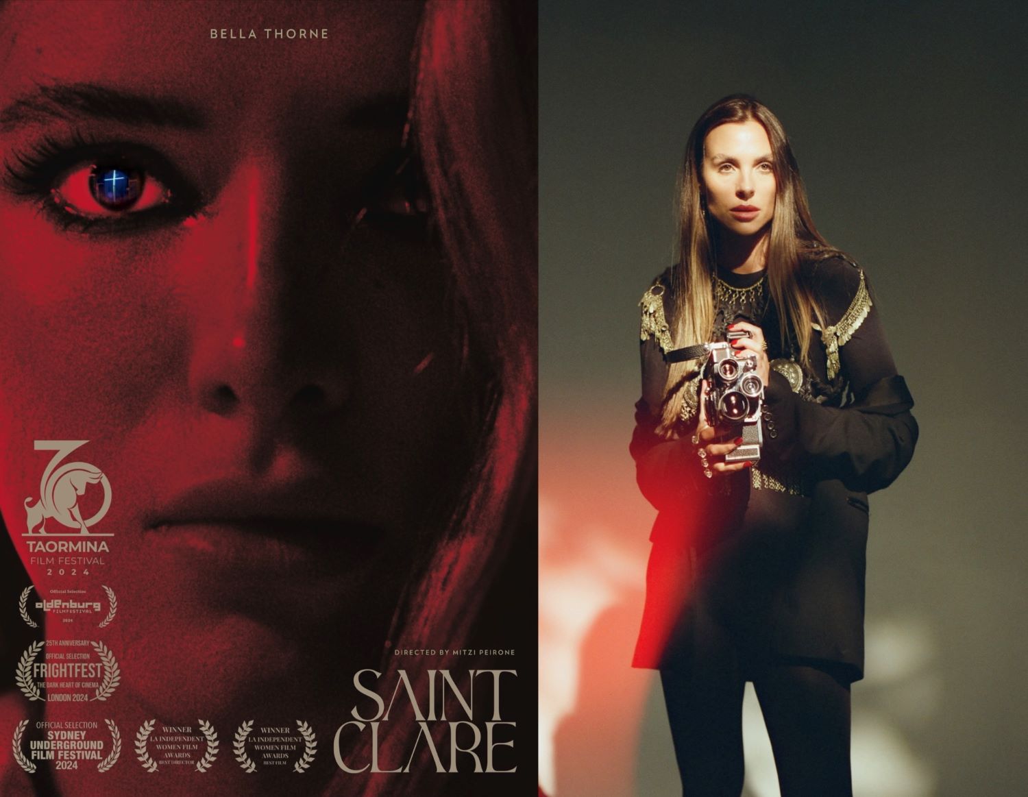 “Gothic art, renaissance paintings and Christian female heroines went into the visual world of Saint Clare: the need to seek visual beauty and symmetry by using one-point perspective shots in the film was specifically saved for holier moments, when she is praying and when she’s in cathedrals, or lit by a divine glow when she is alone in nature; by contrast when she’s on the hunt or when she is piecing things together, the camera becomes a reflection of her neurotic, hectic, manic, almost self-annihilating mind with the use of handheld, specialty lenses and split diopters to enhance the feeling of warped reality and distortion.