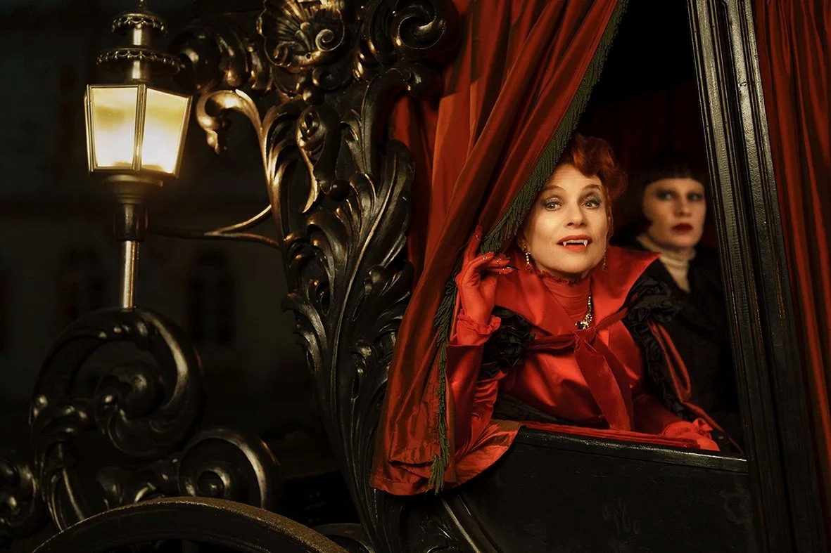 The Blood Countess is a decidedly old-fashioned film, at times resembling a lavish New Year’s pageant. Isabelle Huppert wears ballroom gowns of extravagant architectural design — quite literally so, as in the opening scene the train of her crimson dress is shaped like a gondola cabin. She speaks in her remarkably beautiful voice, sprinkling in Russian words such as golubushka and dushenka, while also invoking Lenin, Stalin, and Mao. All this verbal “klukva” is framed in Fassbinder-like archetypes and interiors. Spiritually, the film feels like a cross between The Bitter Tears of Petra von Kant by Rainer Werner Fassbinder and the lesser-known Berlin werewolf tale Tenderness of the Wolves by his protégé Ulli Lommel.