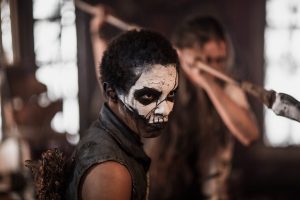 In what is the project’s most interesting conceit, the otherworld that is the school is dynamic, rather than static. The ghost children trapped here have developed their own society, with its own specific rules, customs and taboos. Dormitory walls are covered in graffiti that lays out Zac’s stern dictates to his subjects (“no laughter”), while in another room classroom furniture has bee piled high to create a kind of throne for the teen dictator. Rulers, sports gear and broken window panes have been fashioned into crude weapons, and the children adorn themselves with tribal warpaint, the designs differing according to their place in Zac’s hierarchy.