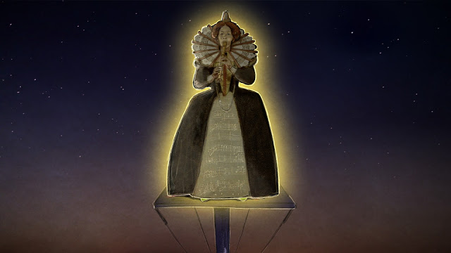“I’ve become very attuned to the troubled expression some folk in the film industry display when I describe to them one of my animated documentary concepts,” says Sophie Raymond. “What? Animation! Documentary! Aren’t they the antithesis of each other? I think the idea of a recorder virtuoso inspires a similar perplexed reaction. So, when Genevieve [Lacey] and I met while filming Mrs Carey’s Concert, we knew we were kindred spirits. A few years later Genevieve applied for an Australia Council for the Arts fellowship to develop some work. One of the projects was simply, some kind of collaboration with me. After much chatting and sharing of things that inspired us, we started to spark on the idea of portraying the feeling of being a creative person, of choosing a creative life, where you are driven by heightened senses and the imagination. We weren’t sure we’d really seen work that had quite done that. Upon reading some of Genevieve’s writings about her time in Europe, I suddenly had this vision of Elizabeth I dressed iconically with a collar made of recorders and manuscript. It’s hard to recall for sure, but I think it was that image that then spurred us forward to harness Genevieve’s singular story and delve deep into her world to find that expression for how it feels to be a musician. She already had that essential cinematic element of transformation going on – every time she put the recorder to her lips.”