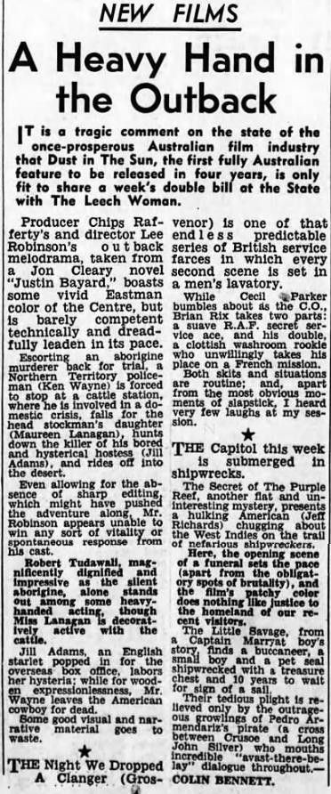 The film was shot in late 1956; according to Cleary, “the crew called it Lust in the Dust” although he said that he never saw the movie as “we were living out of the country when it went into release.” The film had its premiere at the 1958 Sydney Film Festival and received atrocious reviews (Colin Bennett of The Age made the point of bagging it in two separate articles – thanks Colin); there was a minimal cinema release in 1960 in Australia and England although it popped up on television from time to time. (As a side note, Cleary worked on the script for the 1959 film The Siege of Pinchgut based on a story by Robinson.)