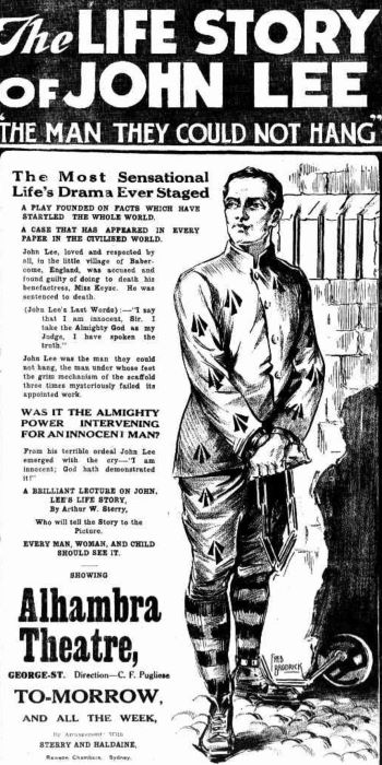 The incident became a tabloid sensation, and Lee cashed in by writing his life story in 1908. This account was then adapted into a stage play which heavily fictionalised events. From what we can gather, there were a few different stage versions going around – copyright law was a little more fast and loose back in the day. An Englishman called Claude Murrell wrote one play of The Man They Could Not Hang, but an Australian actor living in New Zealand, Frank Davenport also had a go. Davenport said he originally read about the Lee case in a book that he picked up in Wellington, New Zealand; he wrote a stage adaptation which invented a love story and some comedy, made it clear Lee was innocent (we gather that the real Lee was a little more shifty), and made up a coda where the British government paid Lee compensation for wrongly imprisoning him (which Davenport thought was a key reason behind the play’s popularity, as it provided a happier ending).