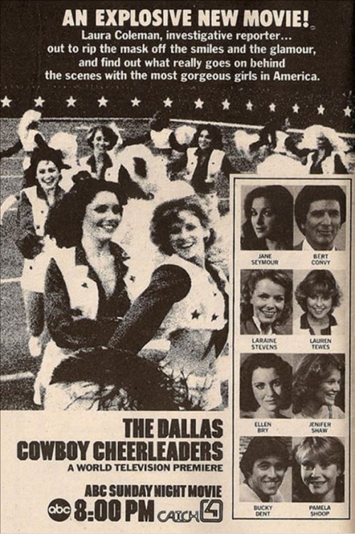 Terrific small screen time capsules, the telemovies Dallas Cowboys Cheerleaders I & II are a must for current fans of the reality hit Dallas Cowboys Cheerleaders: Making The Team, serving as a flavourful popcorn indicator of how much things have changed, and also of how much things have stayed the same with the iconic sideline cheer squad: apart from the quality level of the dancing today, the Dallas Cowboys Cheerleaders audition process is essentially identical to what we see in the telemovies, right down to the old-school whiteboard and ruthless culling system. These two vintage telemovies are well worth tracking down, and pretty much represent the point of the triangle when it comes to fictional depictions of The Dallas Cowboys Cheerleaders.