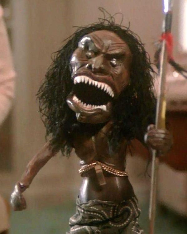 In the third story, “Amelia”, Black is literally put through the physical and emotional wringer. Home alone in her apartment, Black’s Amelia bounces back after an ugly phone argument with her domineering mother by gazing happily at the gift she has bought for her anthropologist boyfriend: a small, wooden fetish doll of a native warrior baring sharp teeth and clutching a spear. According to a scroll included with the doll, this wooden artefact houses the soul of a fallen Zuni hunter…who will very soon spring to vicious, aggressive, relentless life.